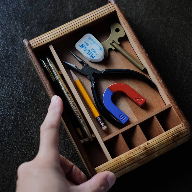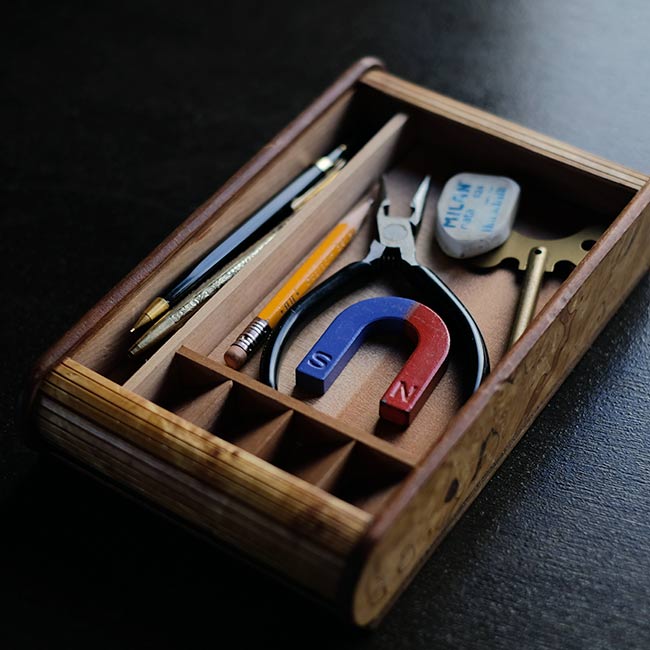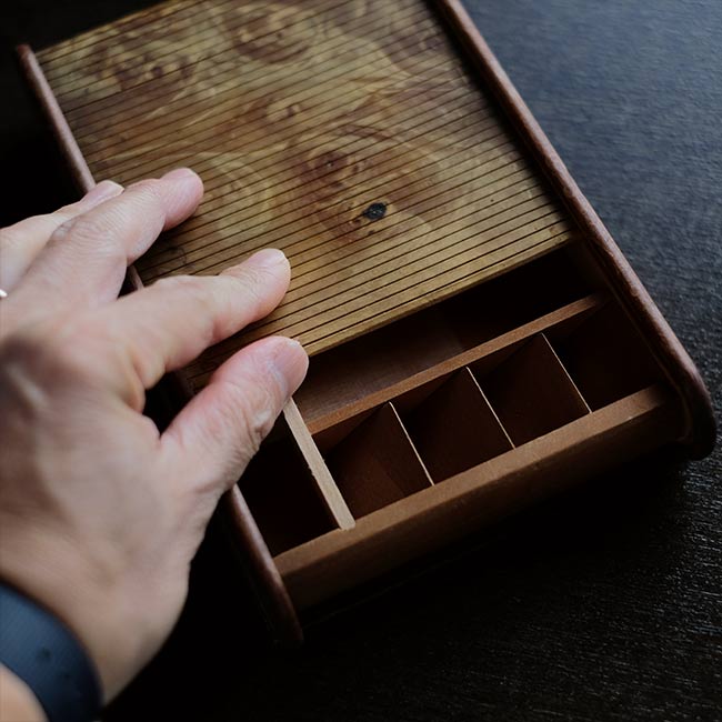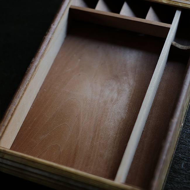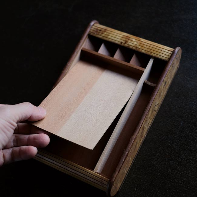 内部は仕切り付きですが、小さな部屋は傾斜がつけてあり、細かいものがつまみ取りやすくなっています。大きな部屋は底の板が取り外すことができますが、隠しポケットになっているわけではありません。ペラペラの紙くらいしか挟めませんが、どういう使い方を想定していたのかちょっとわかりませんでした。