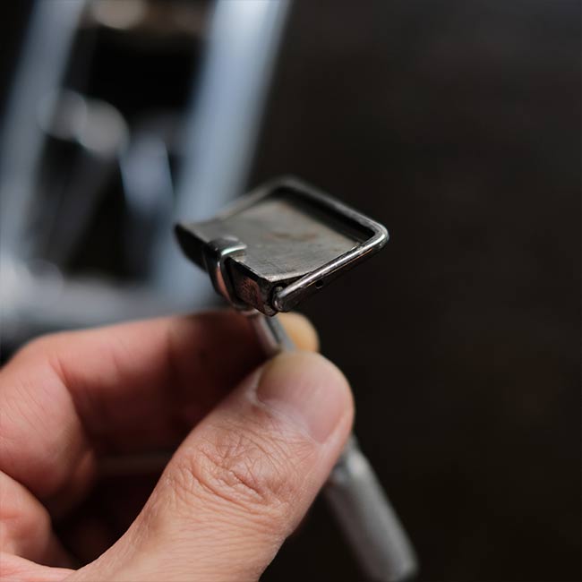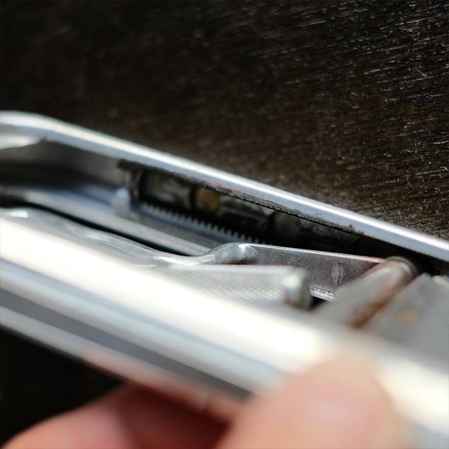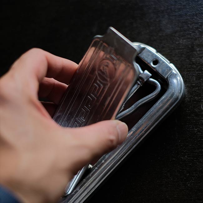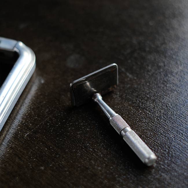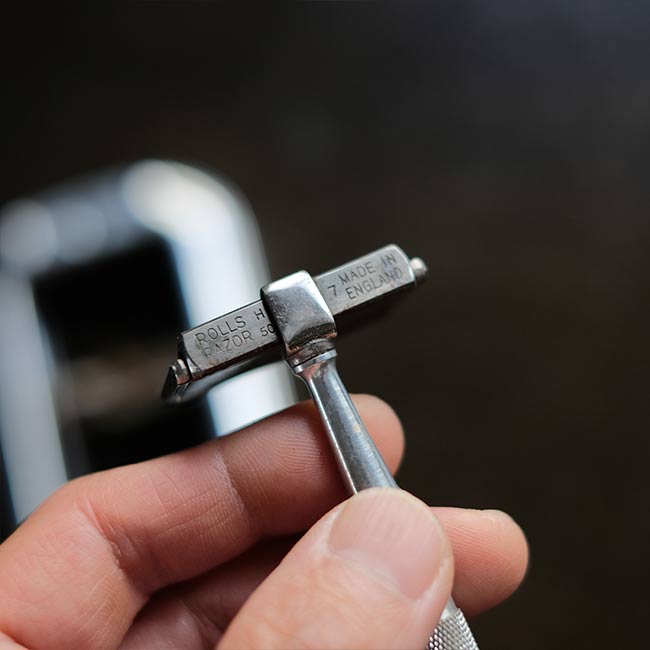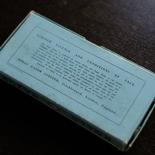 イギリスのRolls Razor社は1950年代までカミソリを製造していたメーカー。メタルのケースの上下の蓋の内側に砥石とレザーがセットされており、ハンドルをスライドさせることで刃を研ぐことができる秀逸なギミックを備えています。