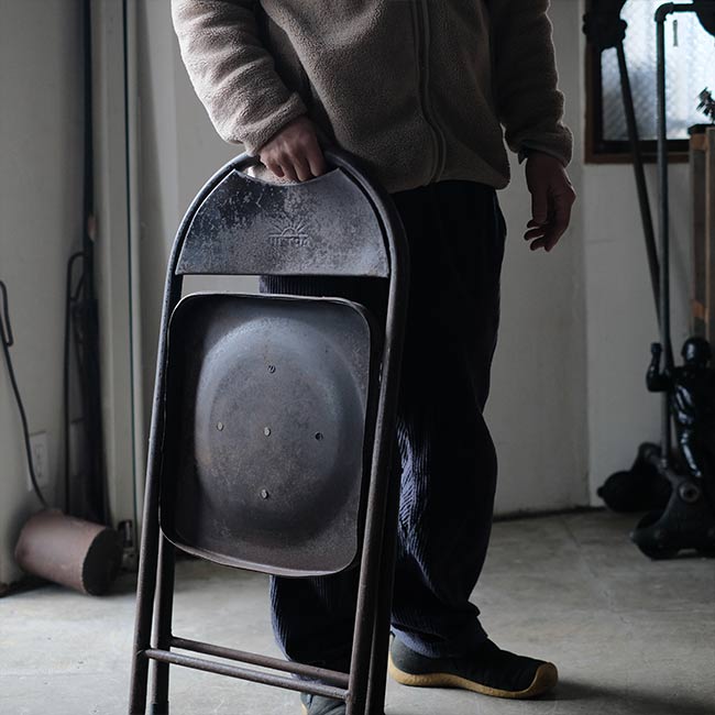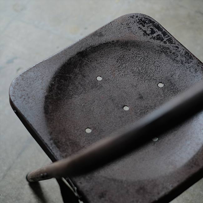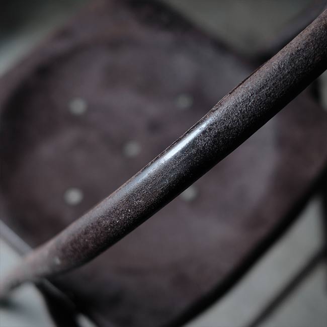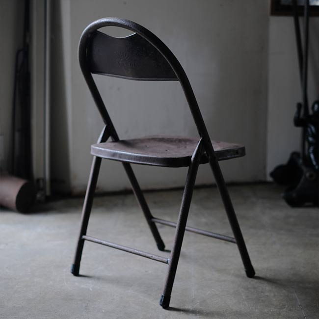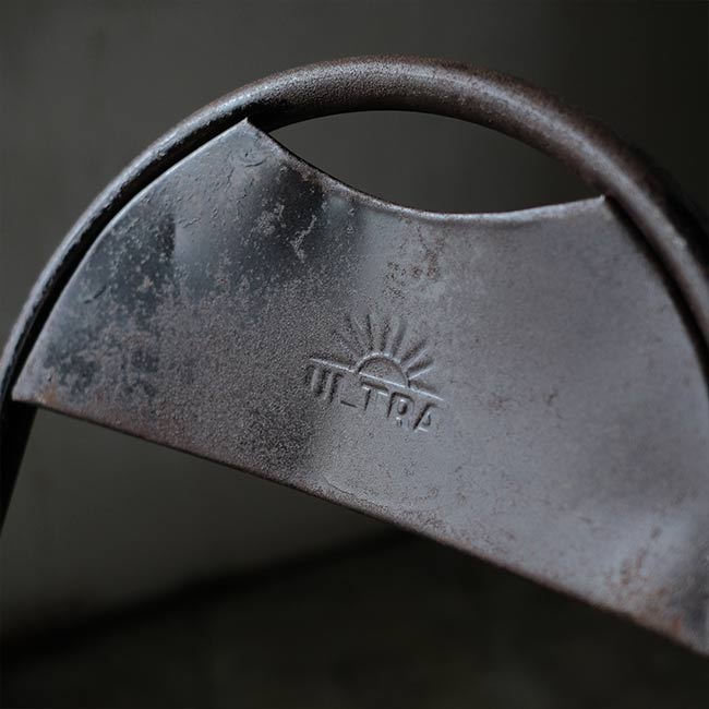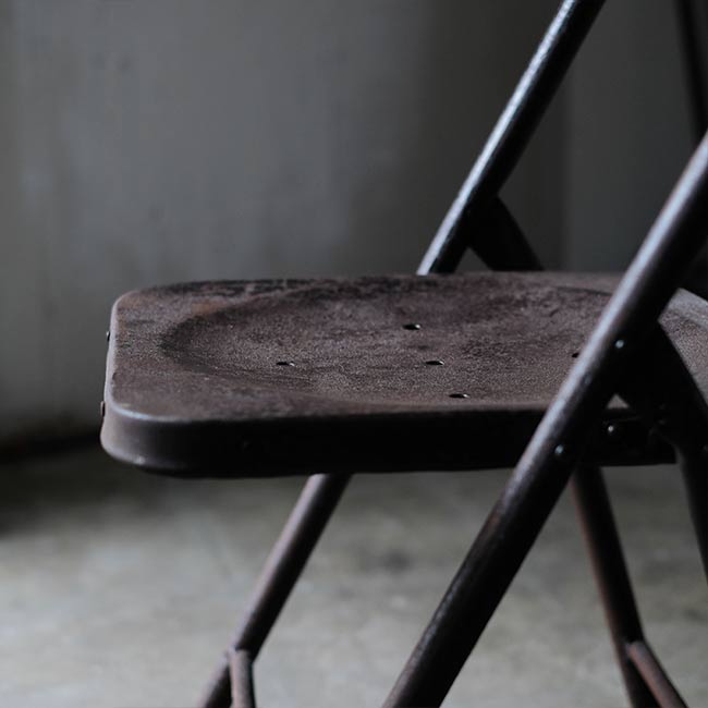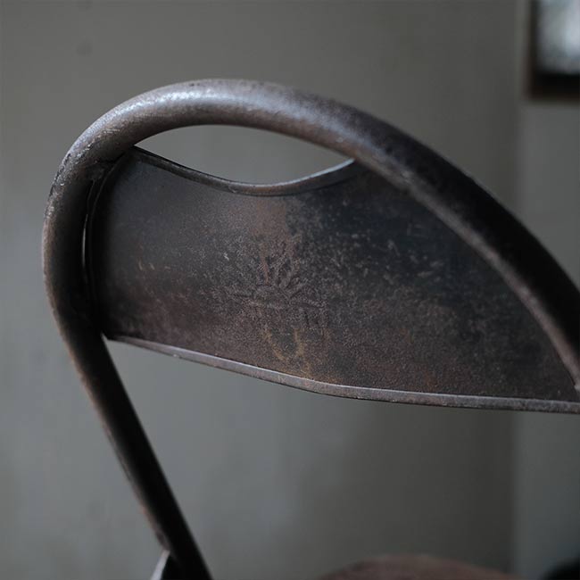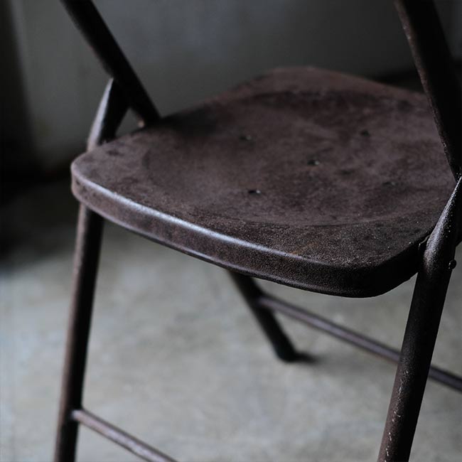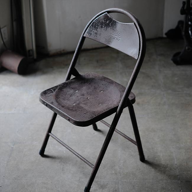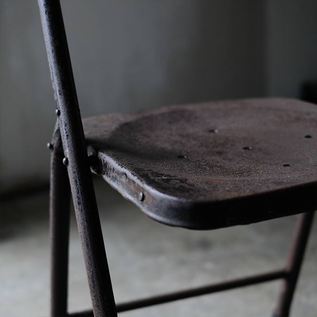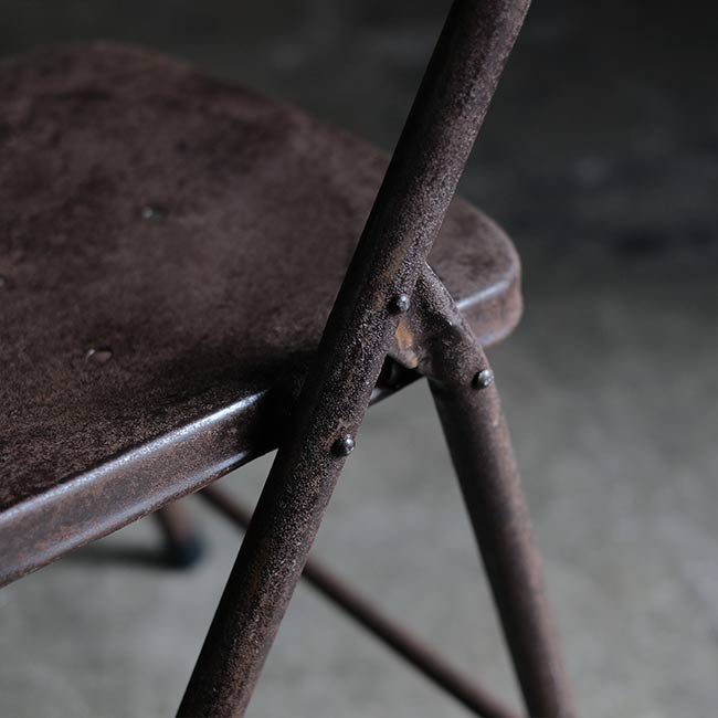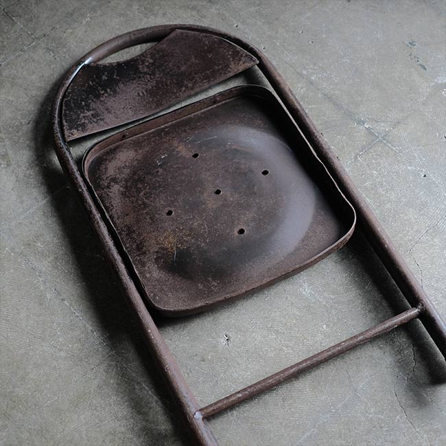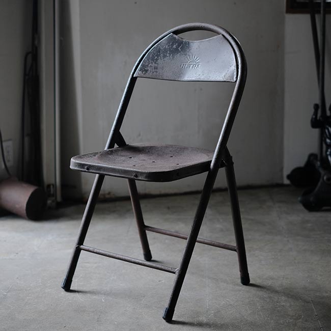 全身くまなくサビたメタルの折りたたみチェア。背もたれに「ULTRA」とありますが、詳細はつかめず。したがって国も年代もわかりませんが、この見た目だけで十分でしょう。