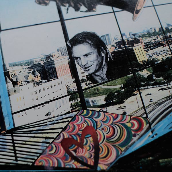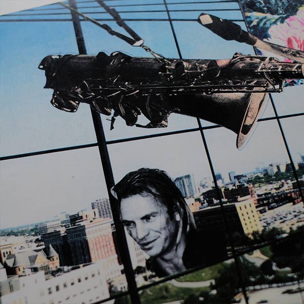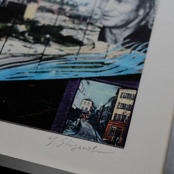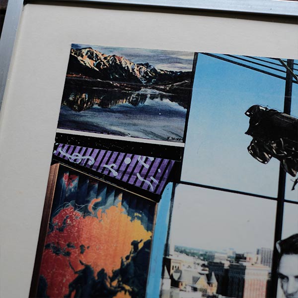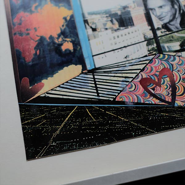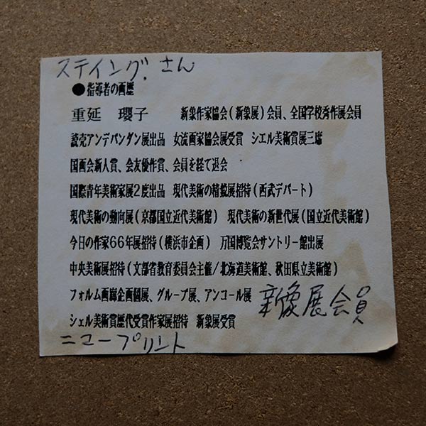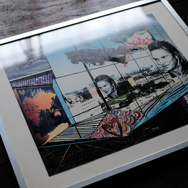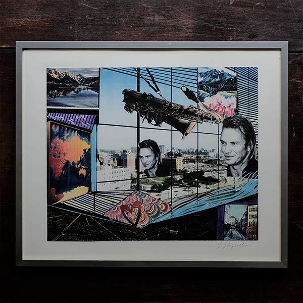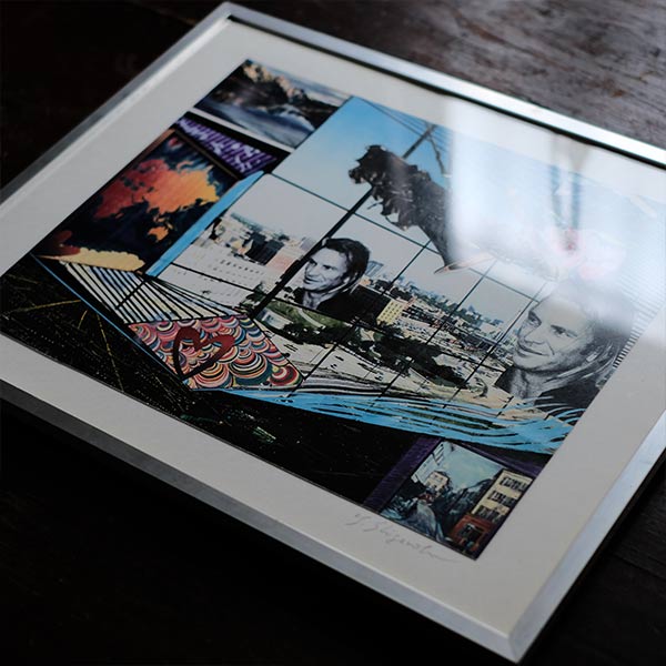 シルバーのシンプルなフレームに収められたSTING(スティング)のコラージュ作品になります。背面のラベルには作者の画歴とともに、「スティングさん」と書かれています。