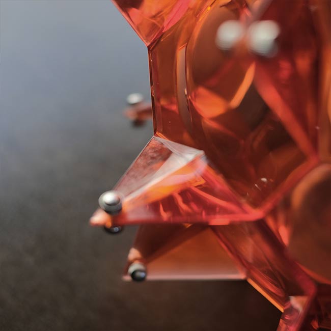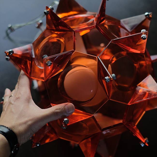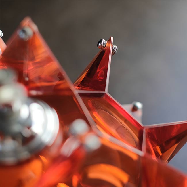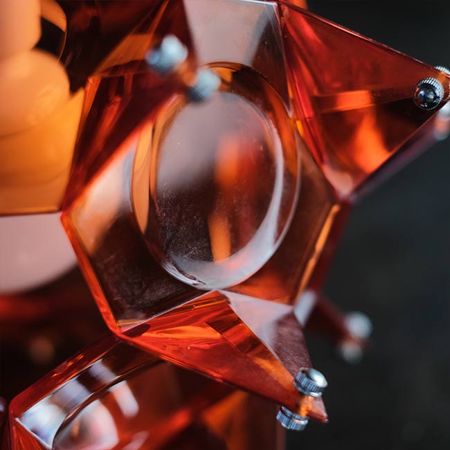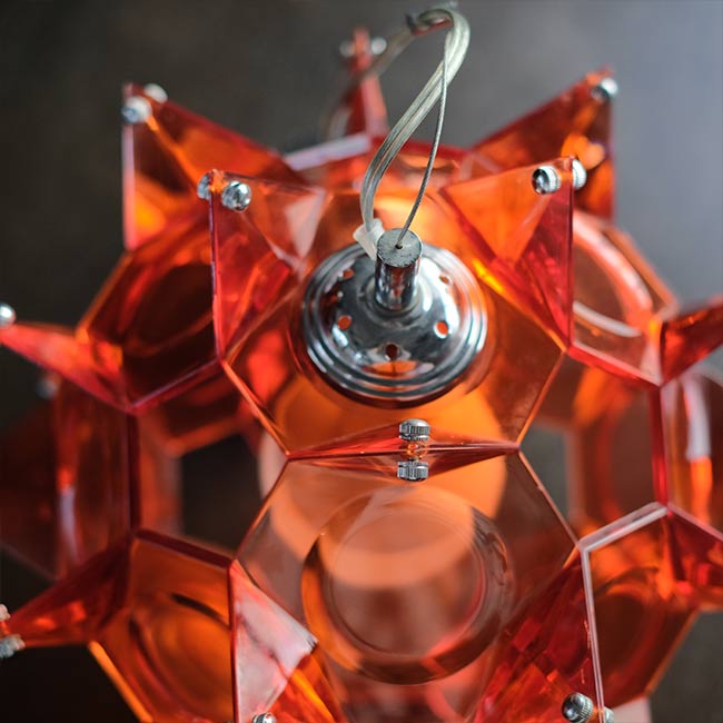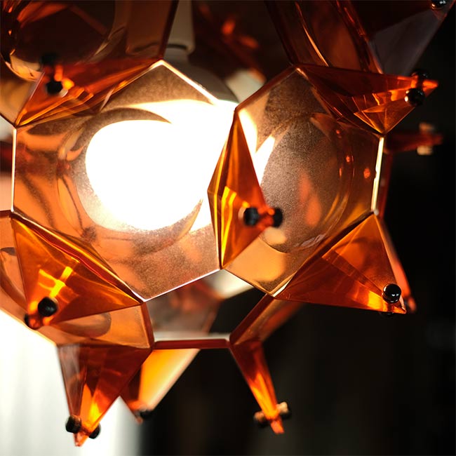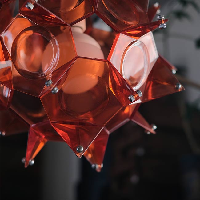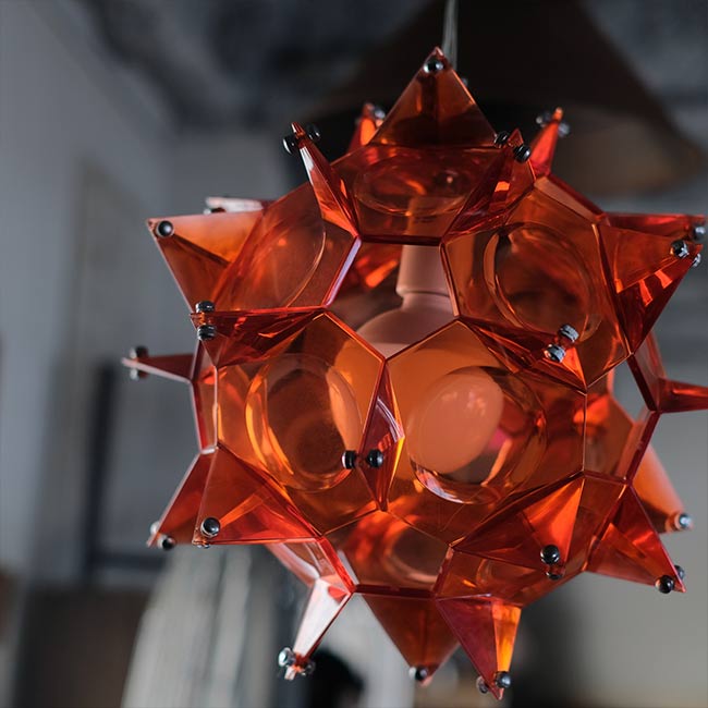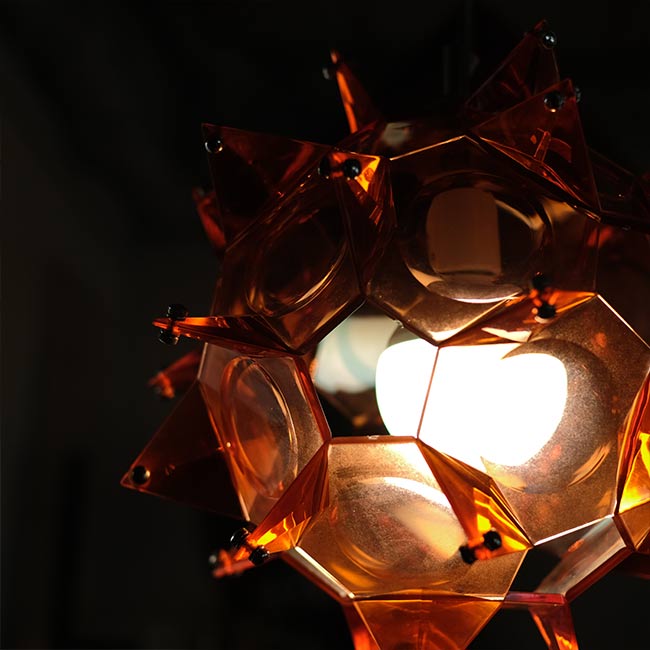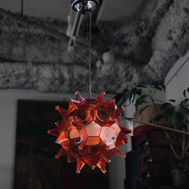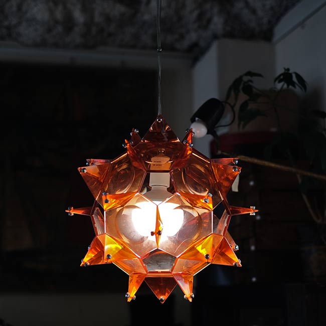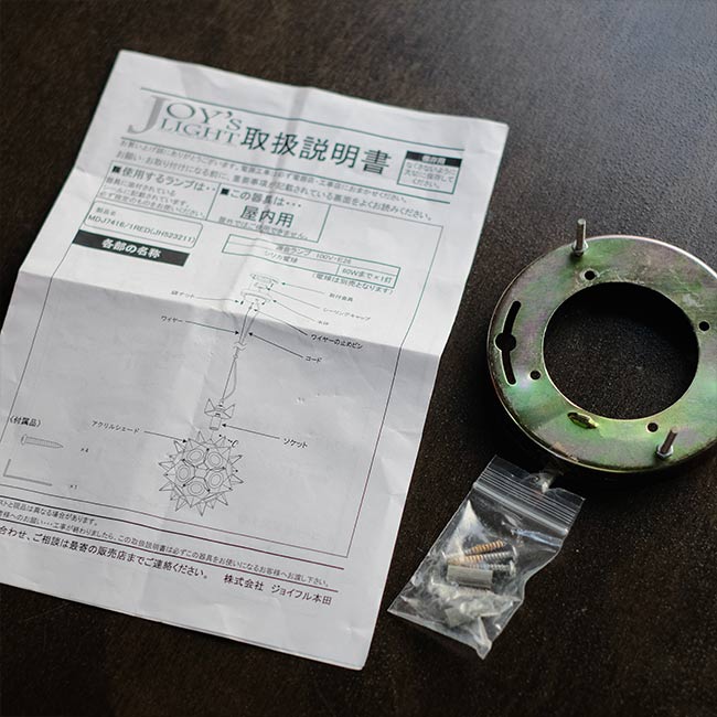 ウイルスか、あるいは北斗の拳の悪役が持ってそうなアクリルのシェードのペンダントライト。1990年代あたりのものと想像しますが、説明書が残ってまして、ジョイフル本田のオリジナル商品だったようです。