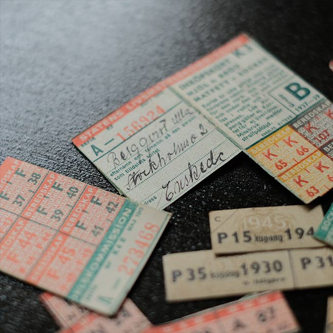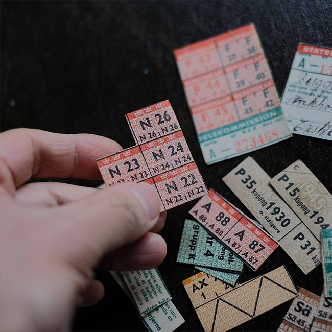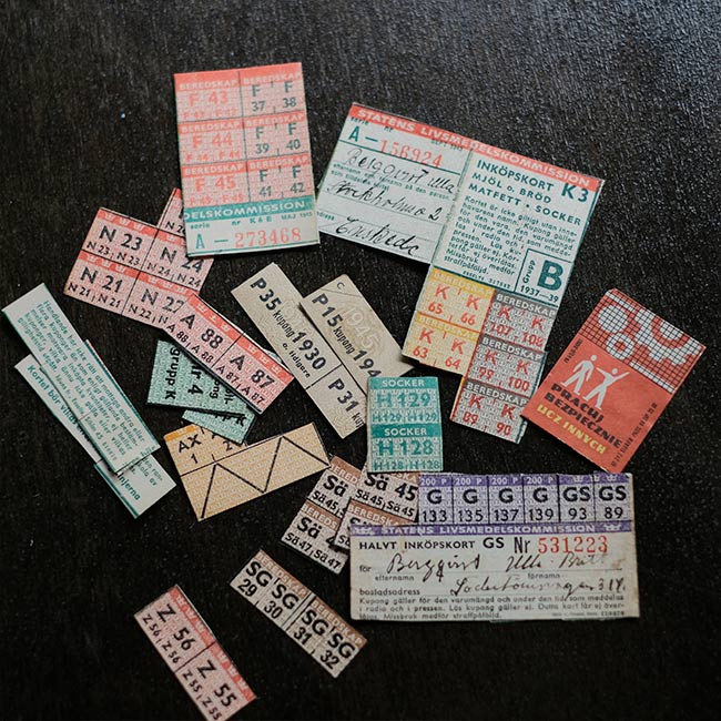 スウェーデンは両大戦には参加していなかったものの、当時物資は不足しており、食べ物や日用品は配給制となっておりました。その時代に使われていた配給チケットとチケットケースになります。
