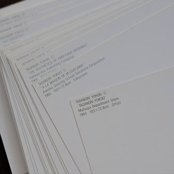 ケースに収められた横尾忠則氏の作品のポストカードのセットです。全部で53枚入っており、1960~1970年代の作品が38枚、1990年代の作品が15枚。それぞれ裏面には、ポスターサイズおよび年号が記載されております。