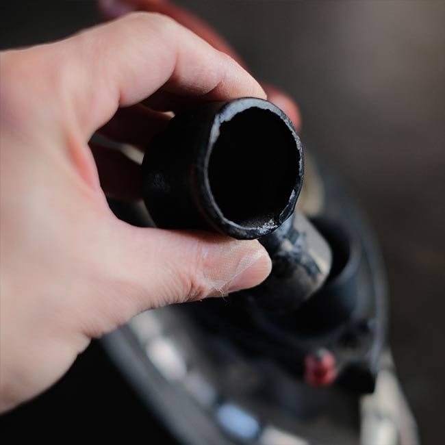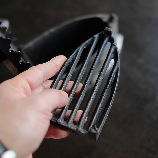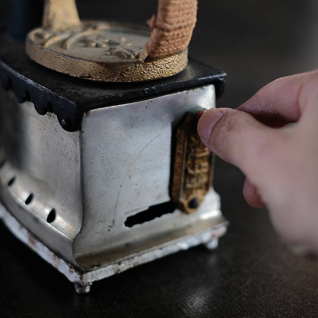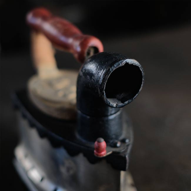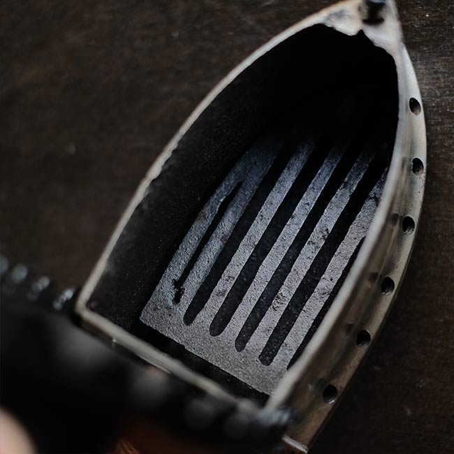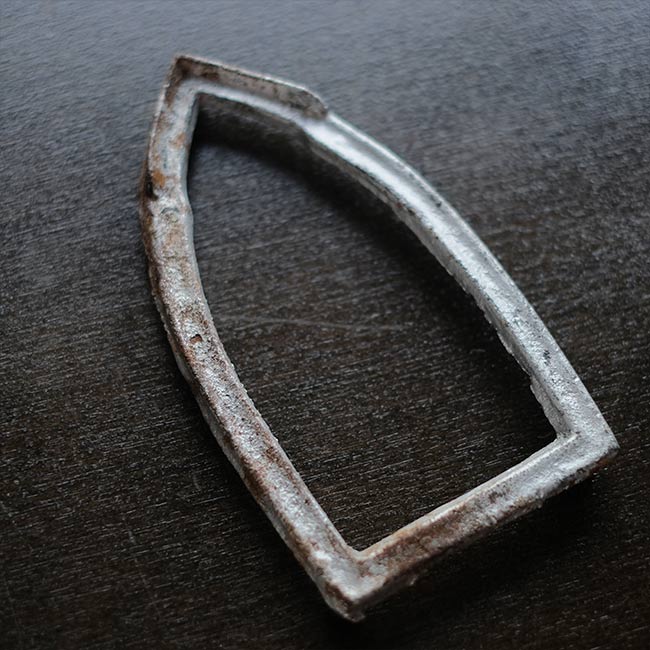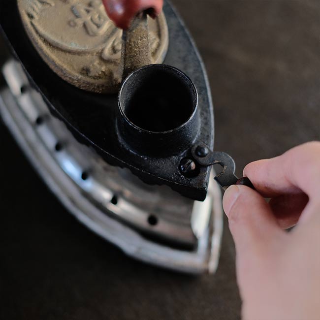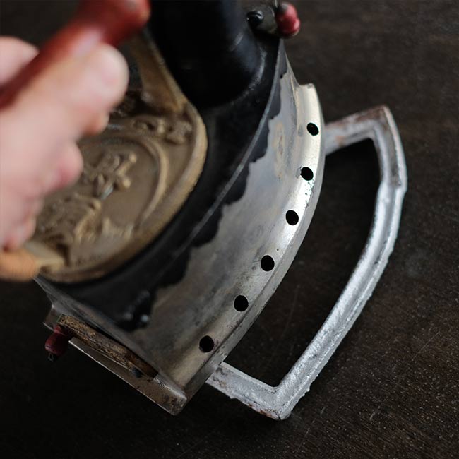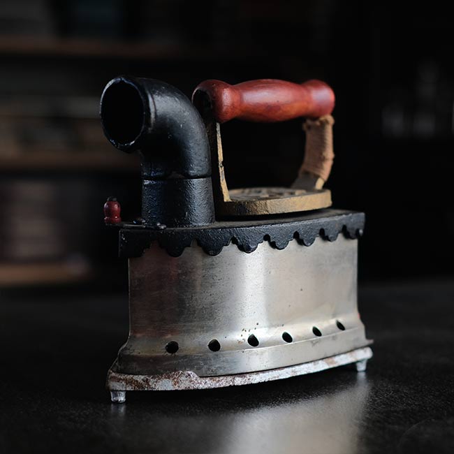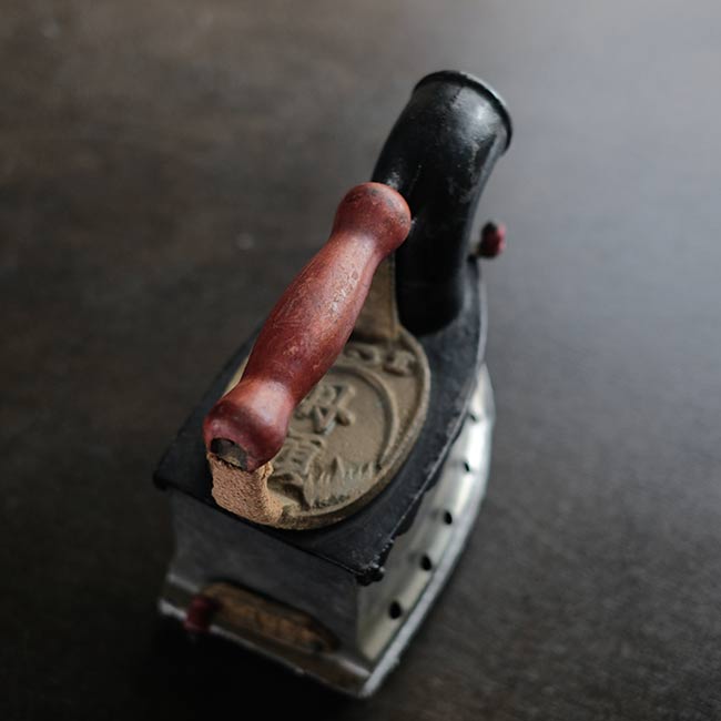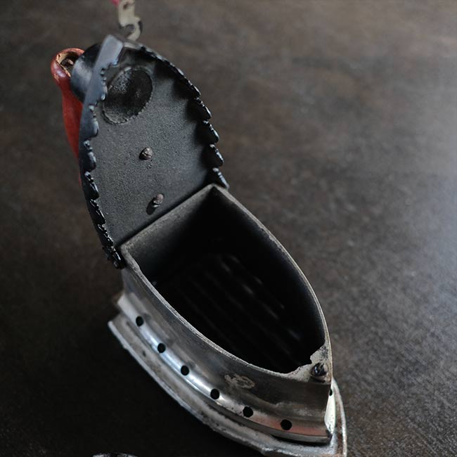 幕末に欧米から伝わり、電気式アイロンが普及する1950年代頃まで使われていた炭火アイロン。読んで字のごとく、中に炭を入れて使うアイロンになります。素材は鉄で、銀色の部分はニッケルメッキのようです。