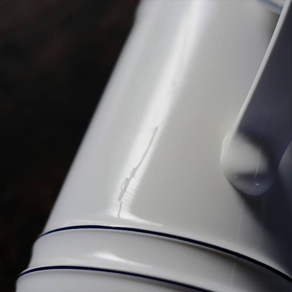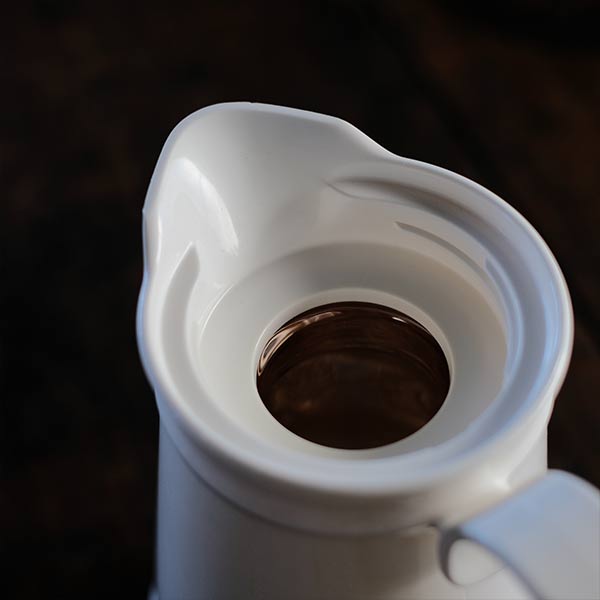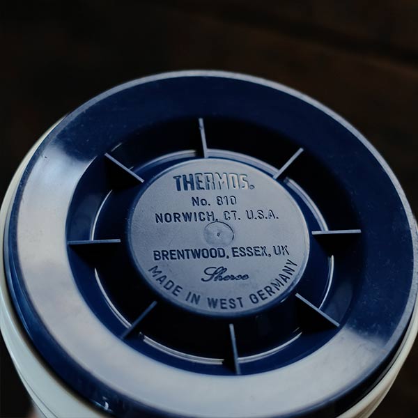 シンプルながらグッドデザインな西ドイツ製のThermosのポットです。容量は1リットルで、内部はガラス製の魔法瓶。本体はプラスチック製で、裾に2本の青いラインが入っているのと、底蓋も青です。