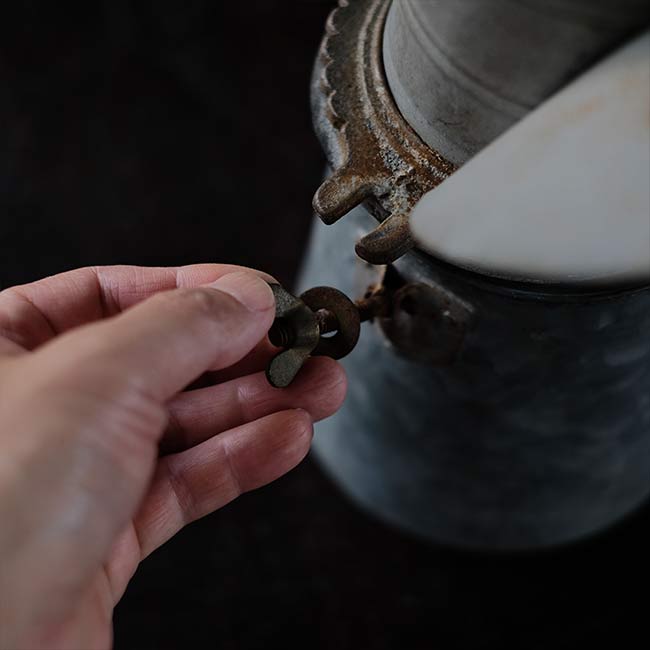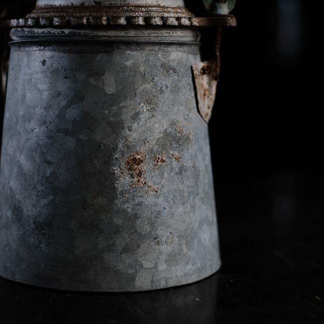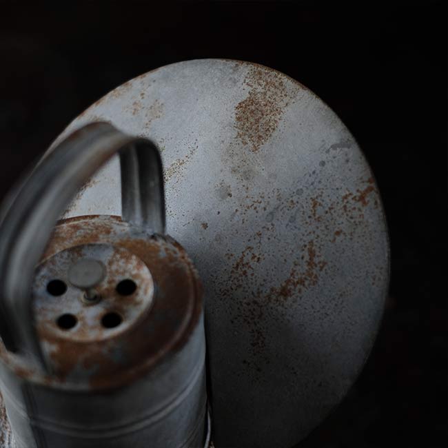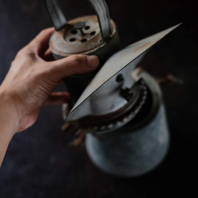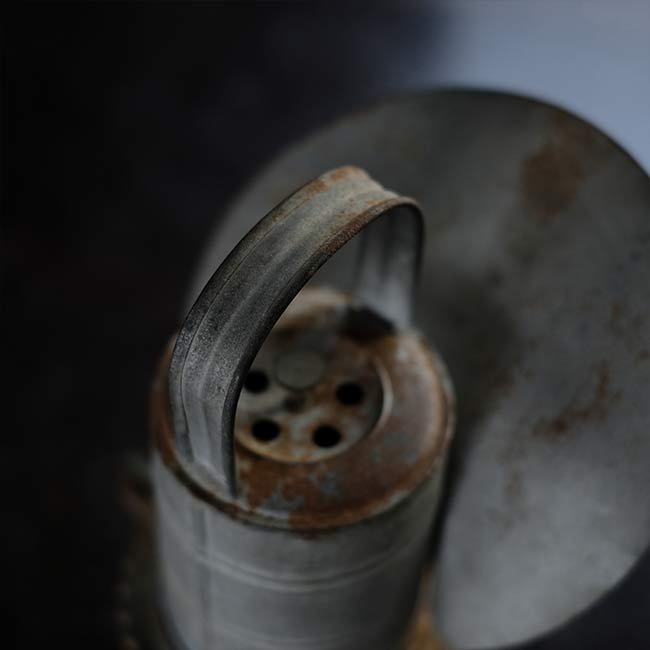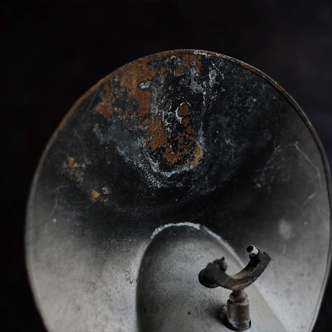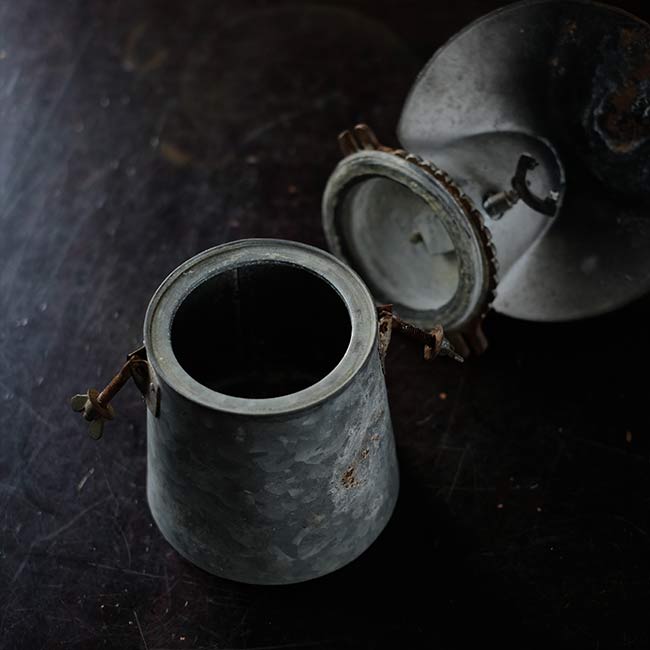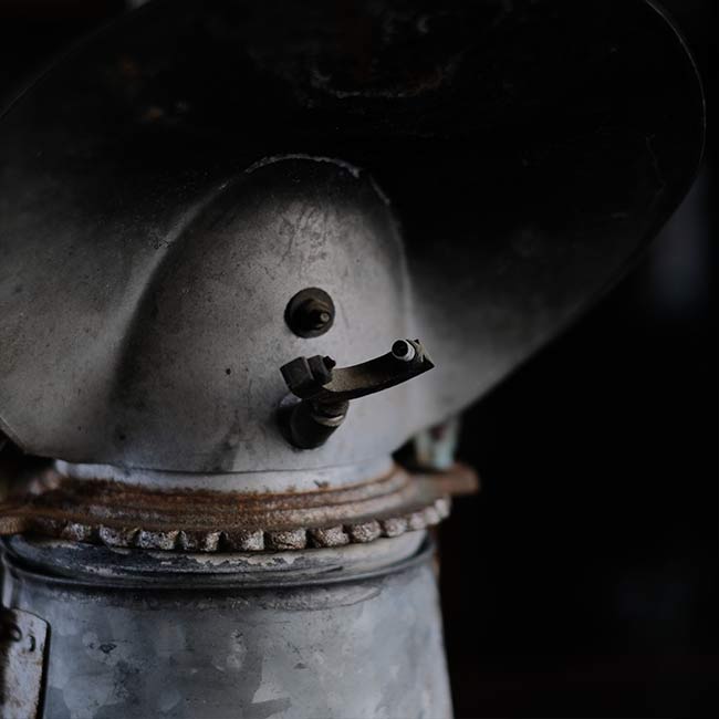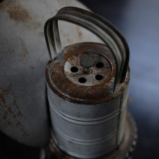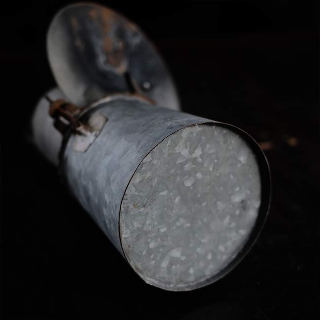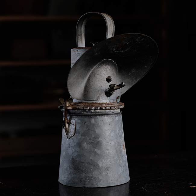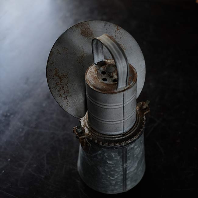 シェードの付いたブリキ製のカーバイドランプです。上下2層になっていて、上に水を、下にカーバイドを入れ、上の層からしたたった水とカーバイドが反応することでアセチレンガスが発生。そこへ点火してランプになるという仕組みです。