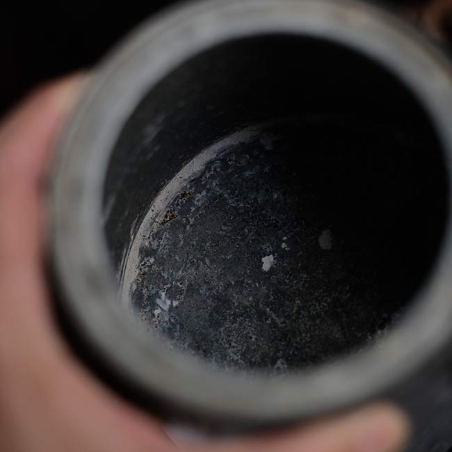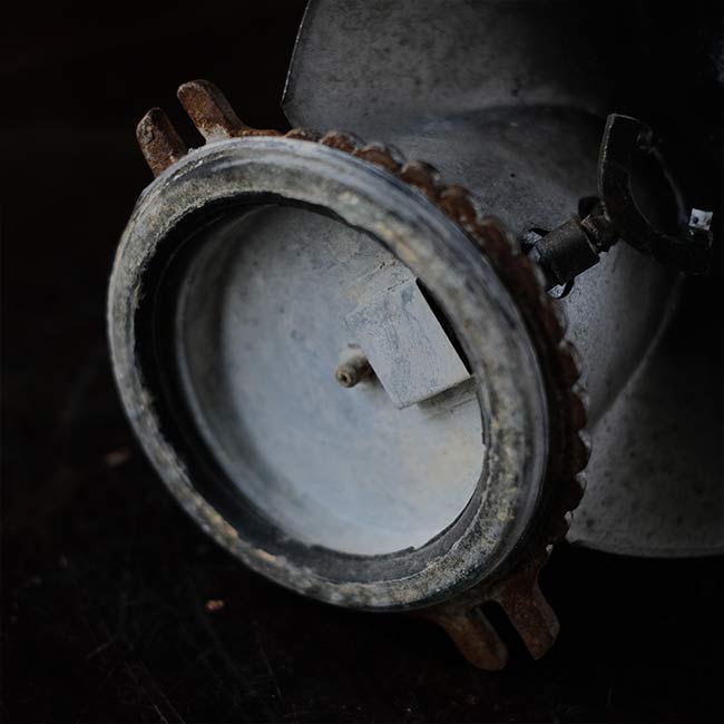 文字が一切入らないためメーカーも年代もわかりませんが、1950年代前後のものではないかなと。サビや凹み、内部にはカーバイドの燃えカスが少し残りますが、ひどいダメージではありません。燃焼については未確認になります。