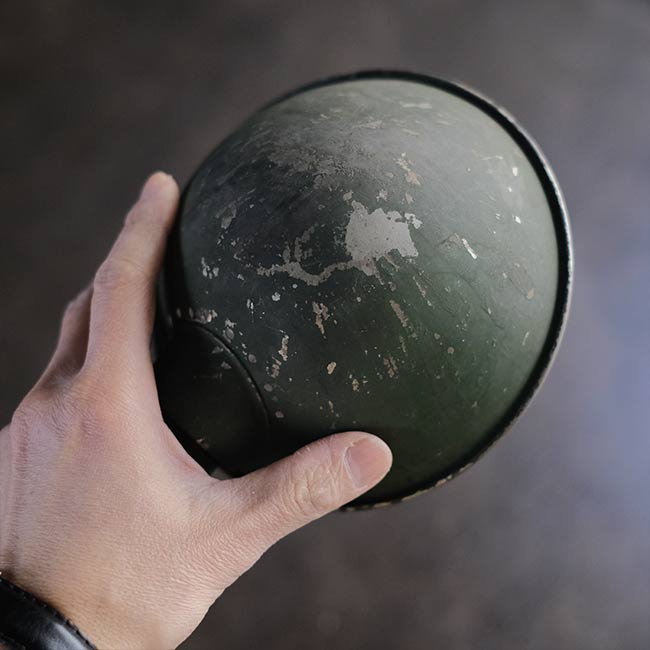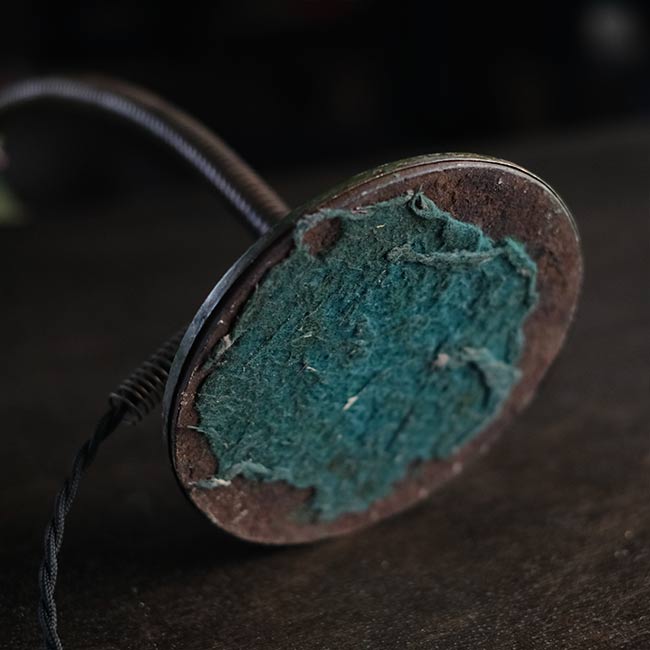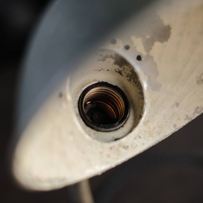 シェードは外側がグリーンで、内側はベージュ。ところどころペイントの剥がれが見られます。台座もグリーンで、底に貼られたフェルトはだいぶボロボロです。