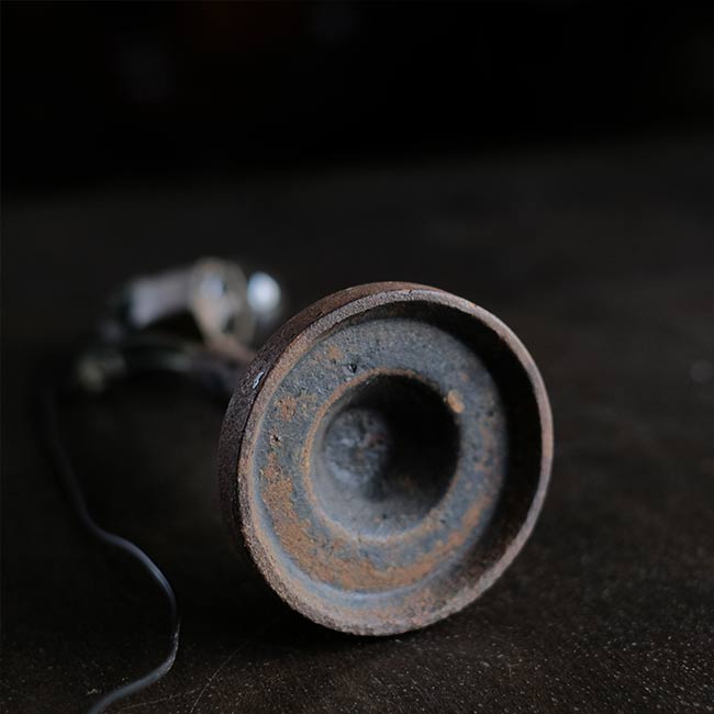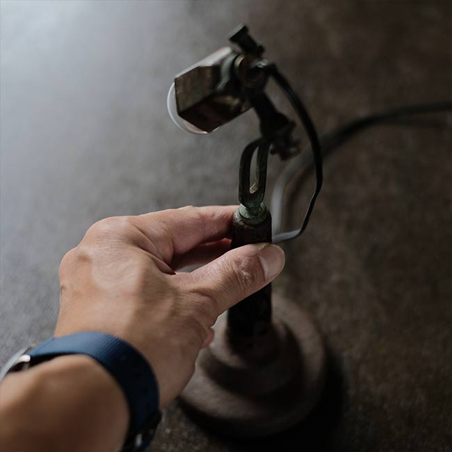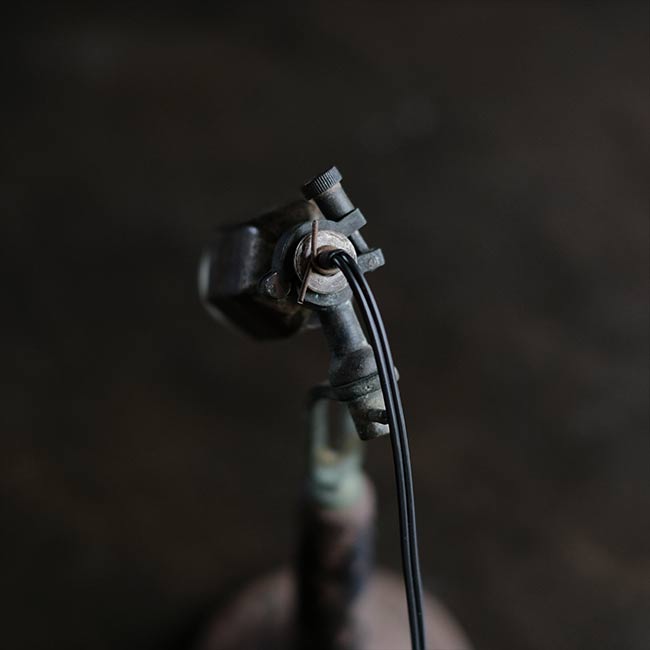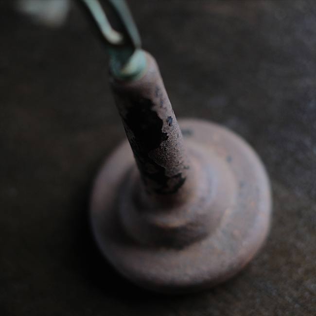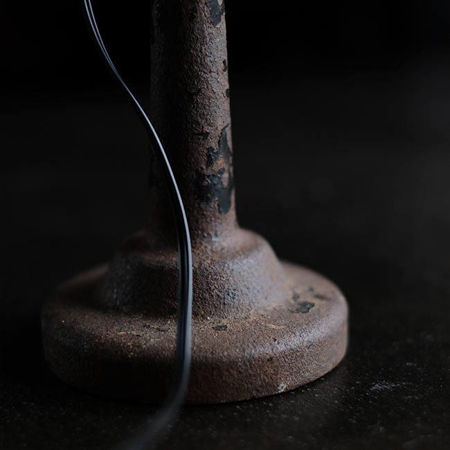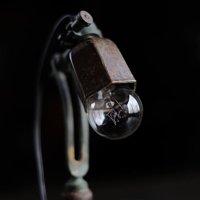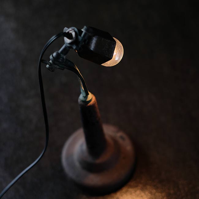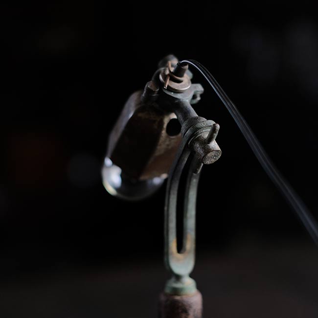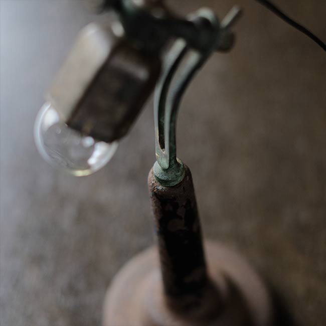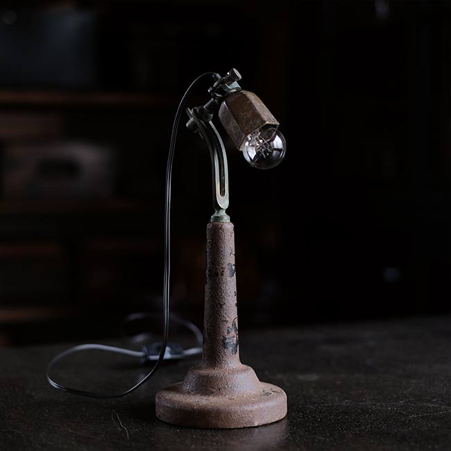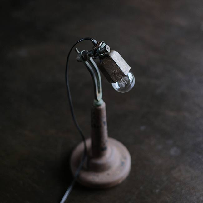 鉄製のベースからグニャっと曲がったアーム、開口部が六角形をしたシェード部分まで、すべて1つの古道具として出てきたもの。工具か工作機器かなにかかと思ったのですが、なんだかわかりませんでした。ほぼ剥がれたベースの塗装、シェードの形状、ジョイントやその周辺に浮いた緑青など、魅力たっぷり。創作意図のない一点物の小さなランプです。