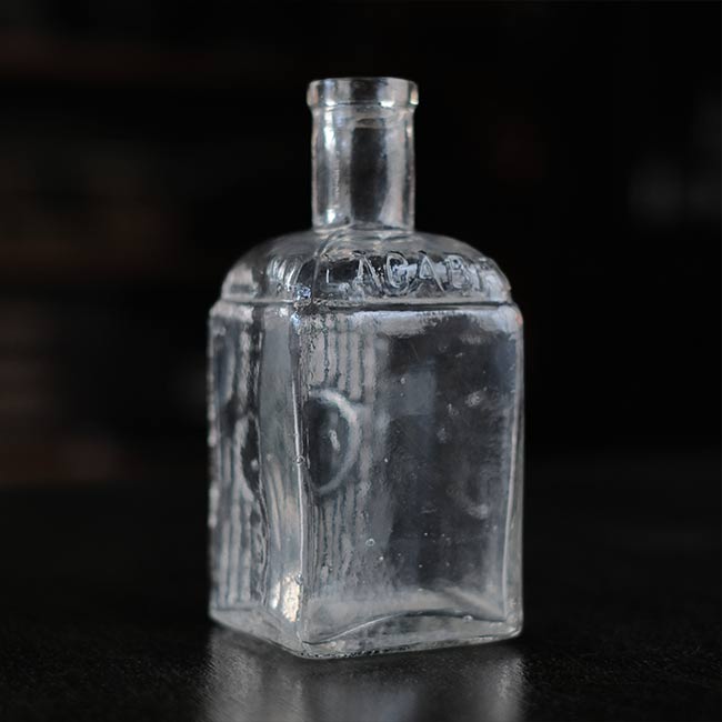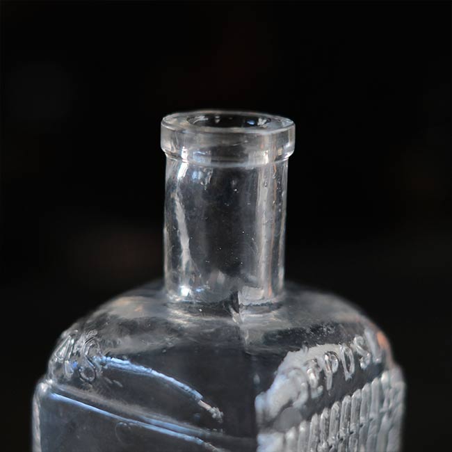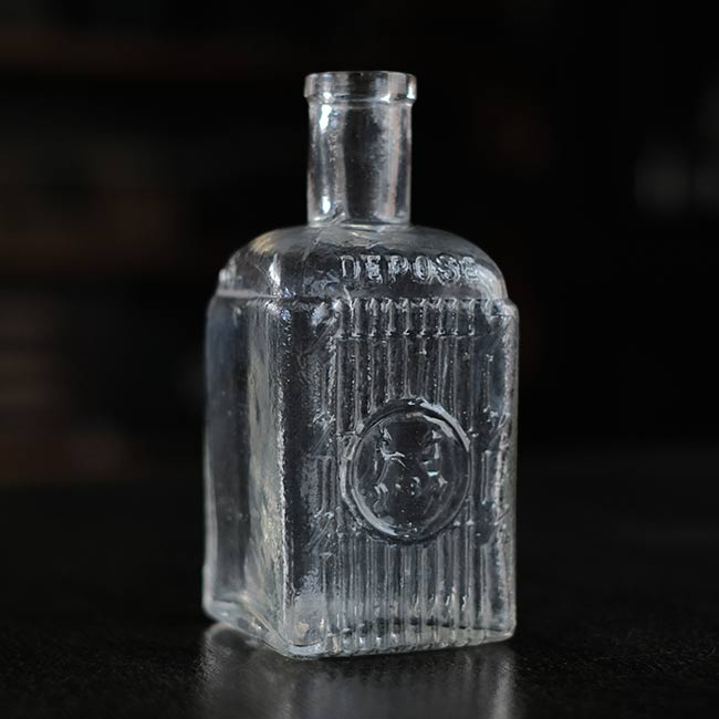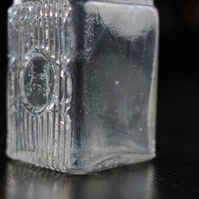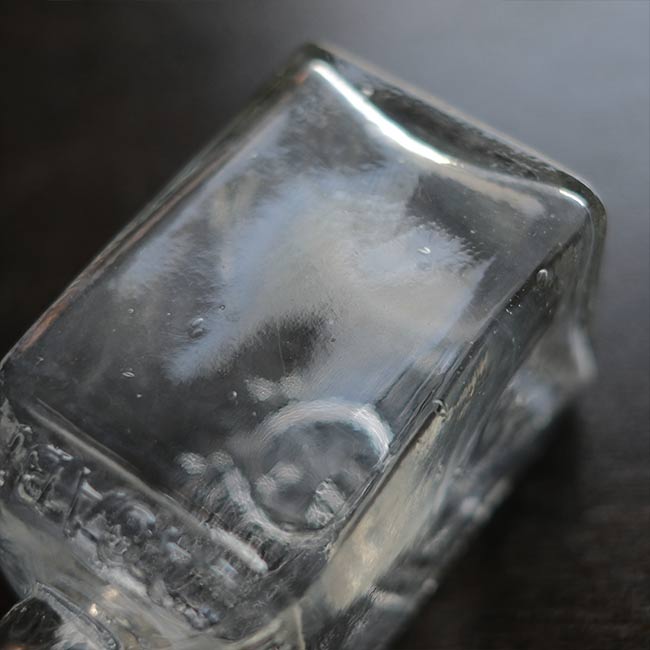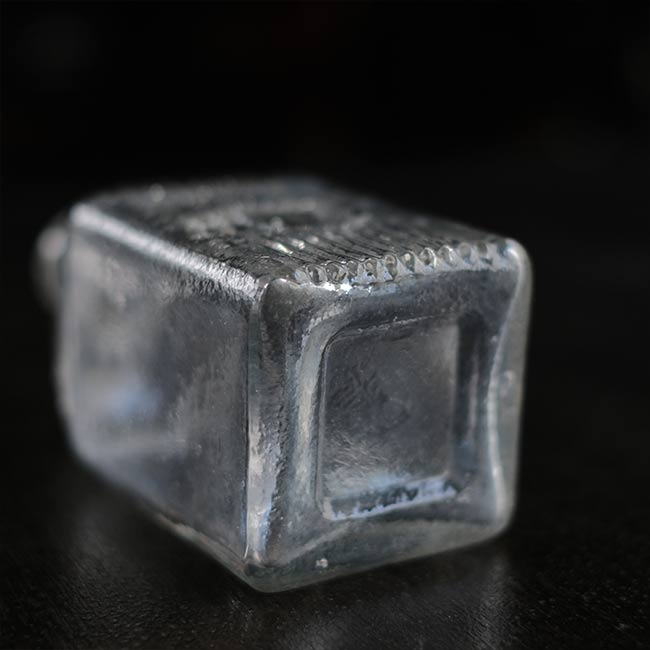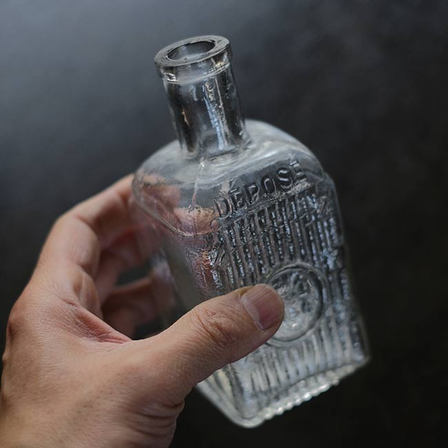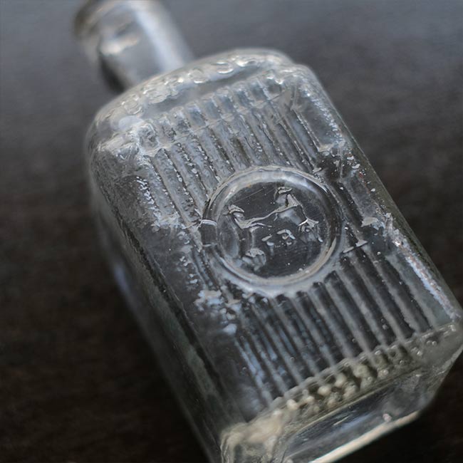 安定感のあるフォルムのこちらは、下剤のボトルだったそうです。手前に二頭の馬が描かれたマークが入っていて、ガラスはシワや気泡の入った味のある質感。