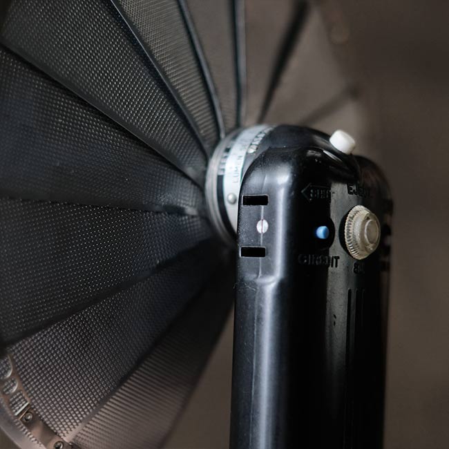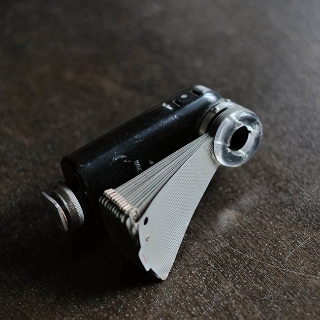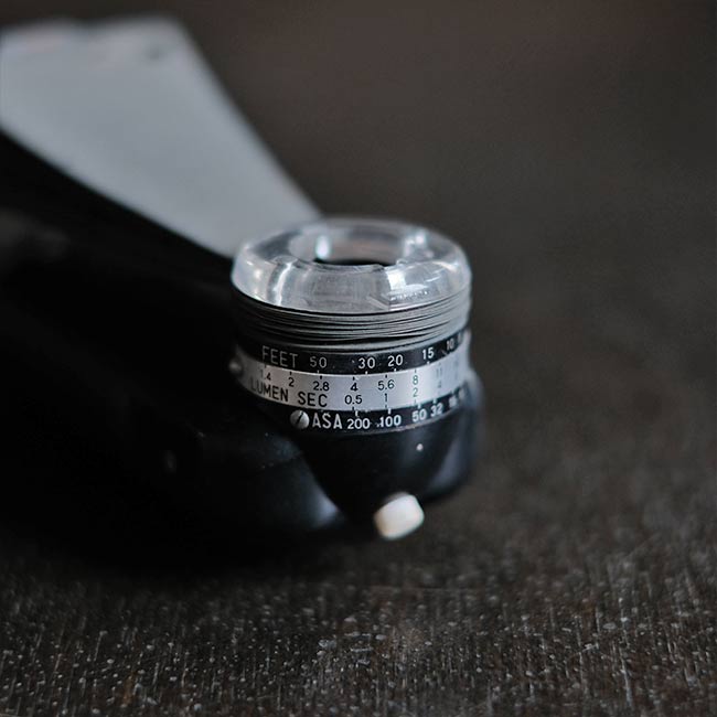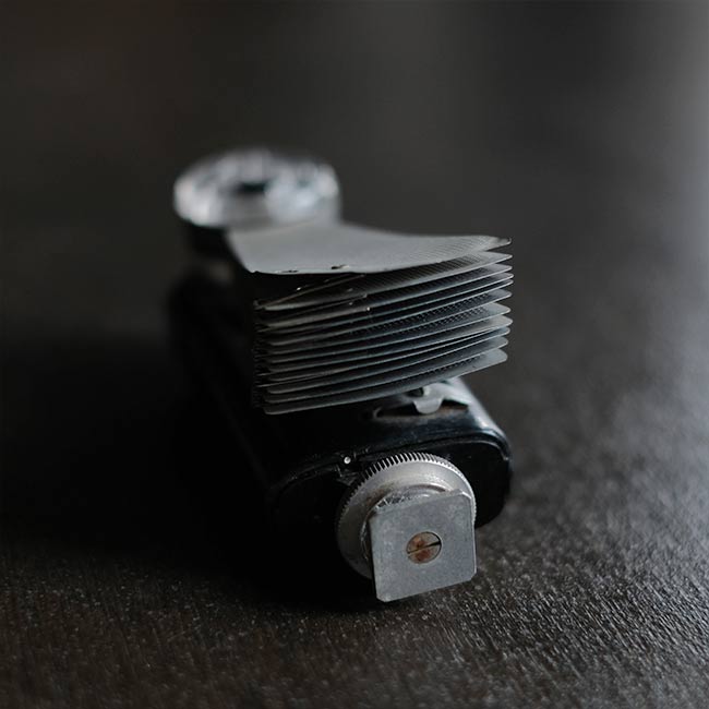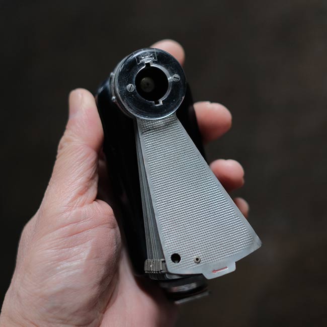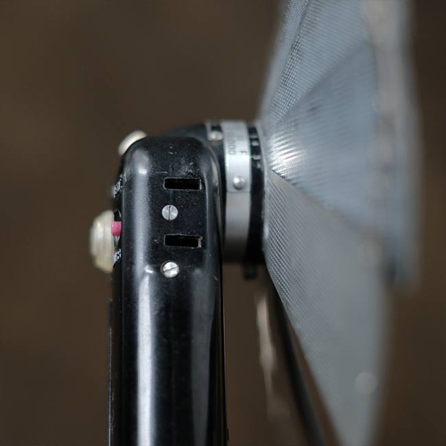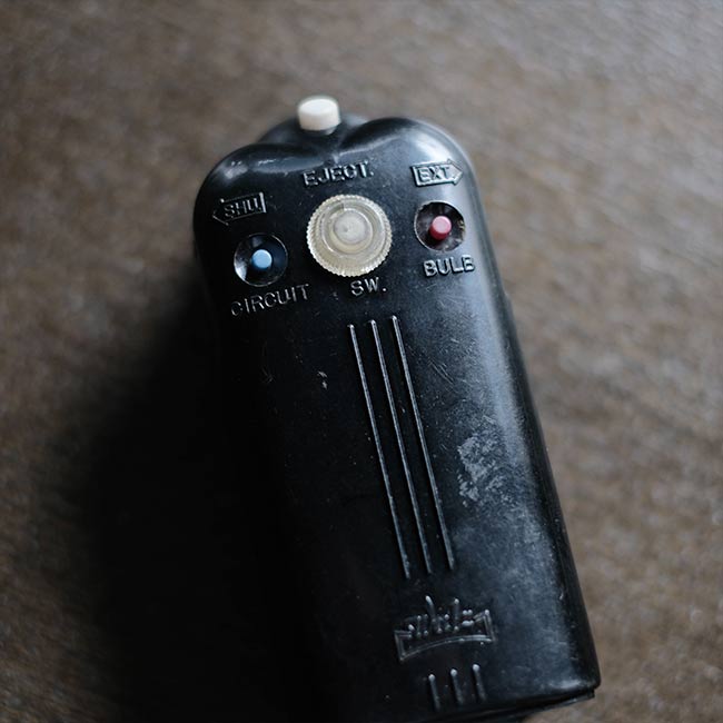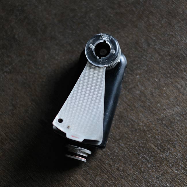 写真用品メーカーのワルツが製造していた小型のフラッシュになります。カメラに取り付けて、折りたたんだ反射傘を矢印の方向に広げて使います。おそらく1950年代のものでしょう。