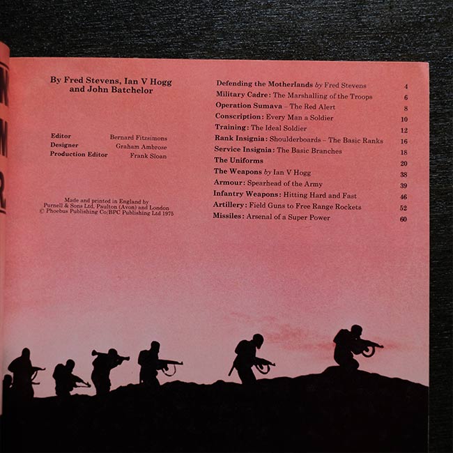 ソ連軍の軍服と兵器についてまとめた一冊。徴兵制や訓練、階級章や服務章、装甲、歩兵武器、砲兵、ミサイルなど多岐にわたって豊富な写真と図解で解説しています。