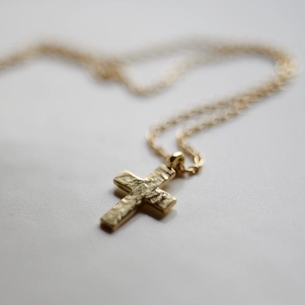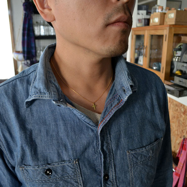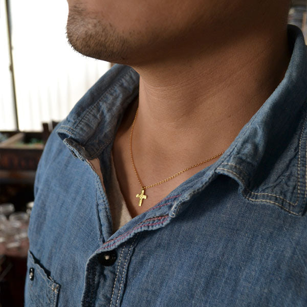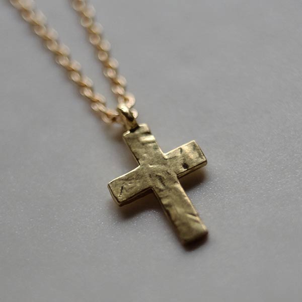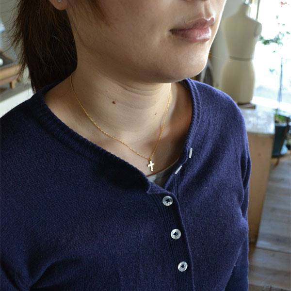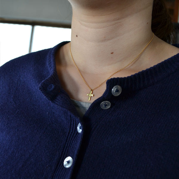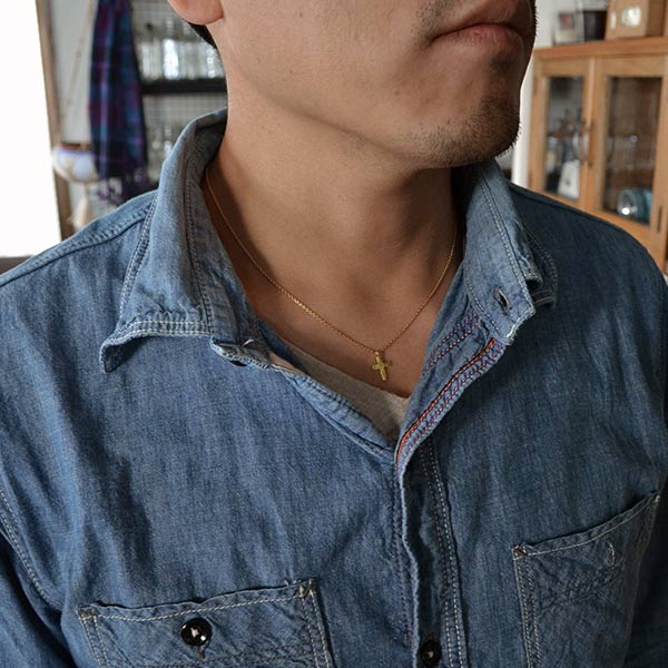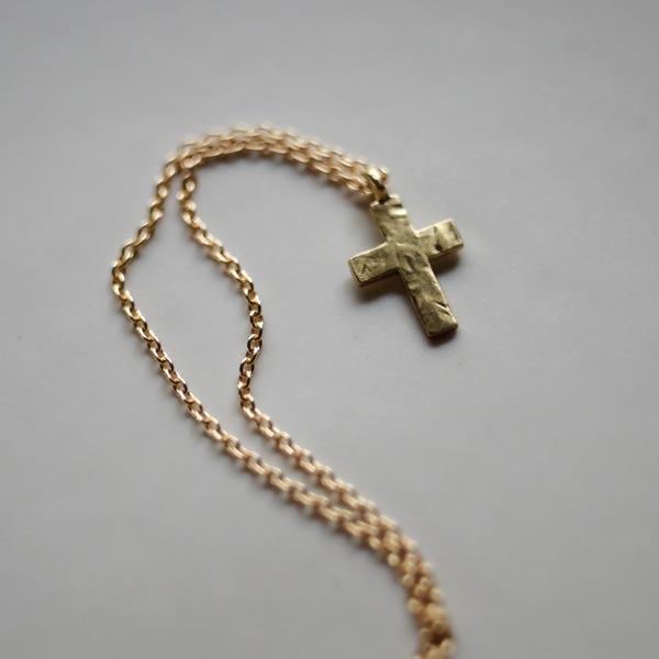 クロスの表面はあえてキレイには仕上げず、傷や凹凸のあるラフな表情に。サイズは縦12mmと、かなり小さめですが、かわりに幅の広い愛嬌のあるデザインに仕上げてもらいました。小ぶりなため決して強い主張はありませんが、胸元でひそかに存在感をアピールしてくれます。