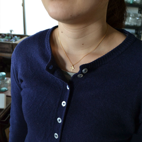 ゴールドは日本人の肌には合わないのでは?といったご意見を伺うことがありますが、相当太目のものでない限り、実は意外と馴染んでくれます。特にこのネックレスはトップもチェーンも控えめなサイズ感なので、ゴテゴテした印象はまったくなく、シルバーアクセサリーのような感覚で毎日気軽に着けていただけます。