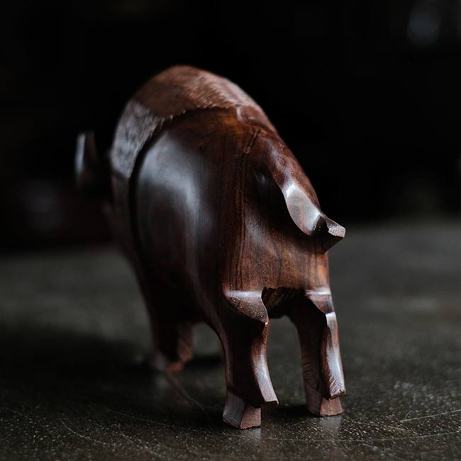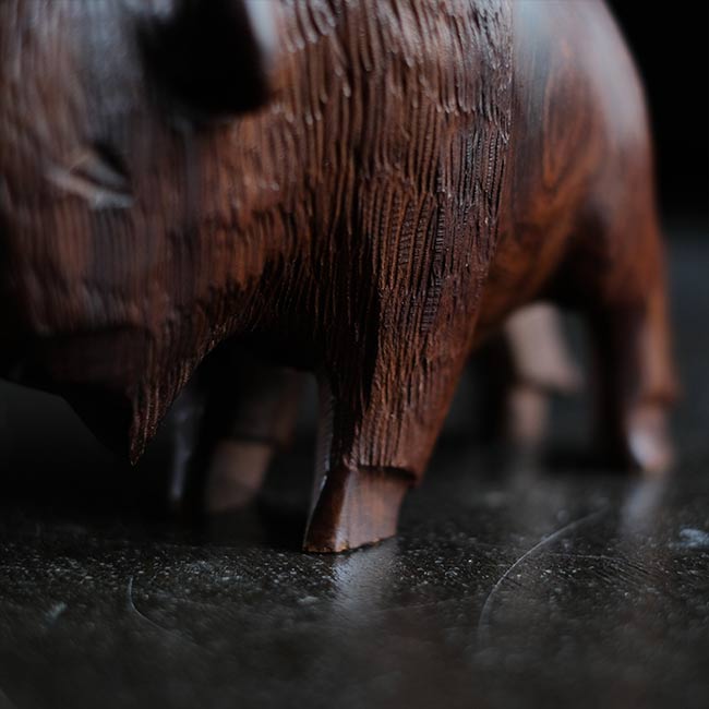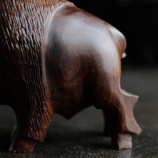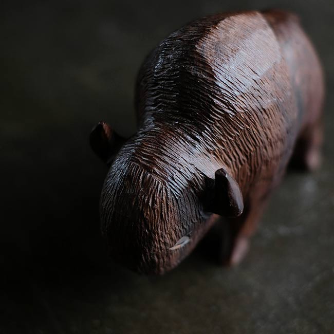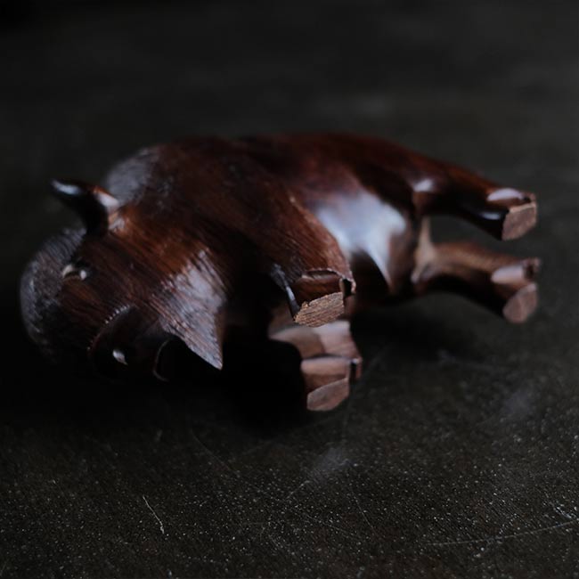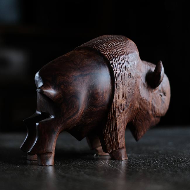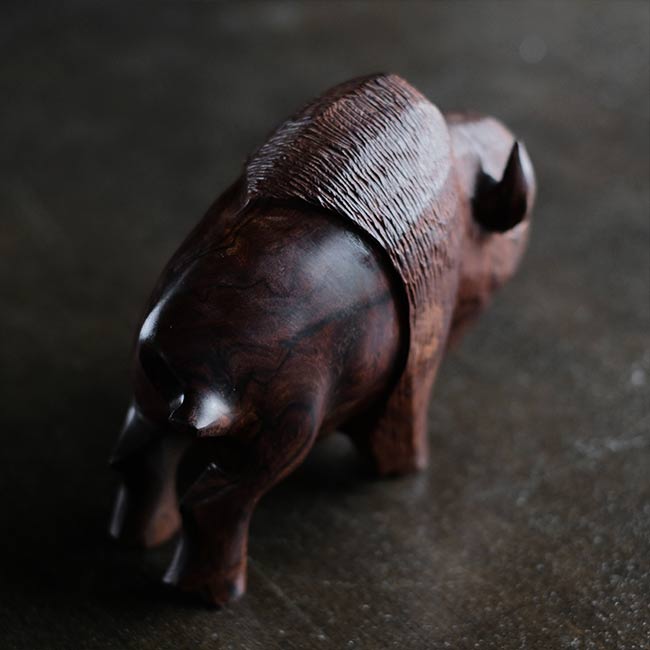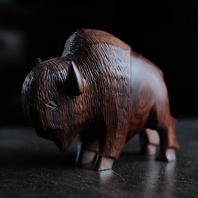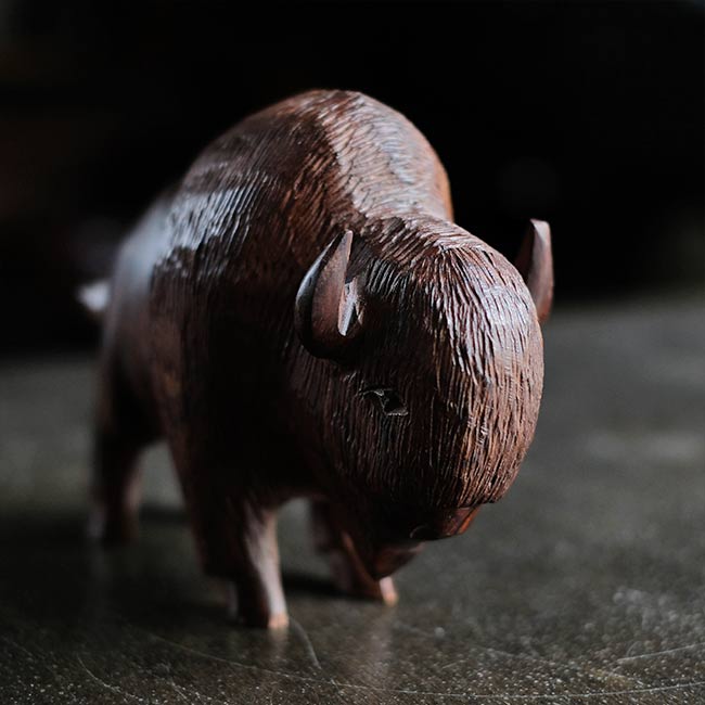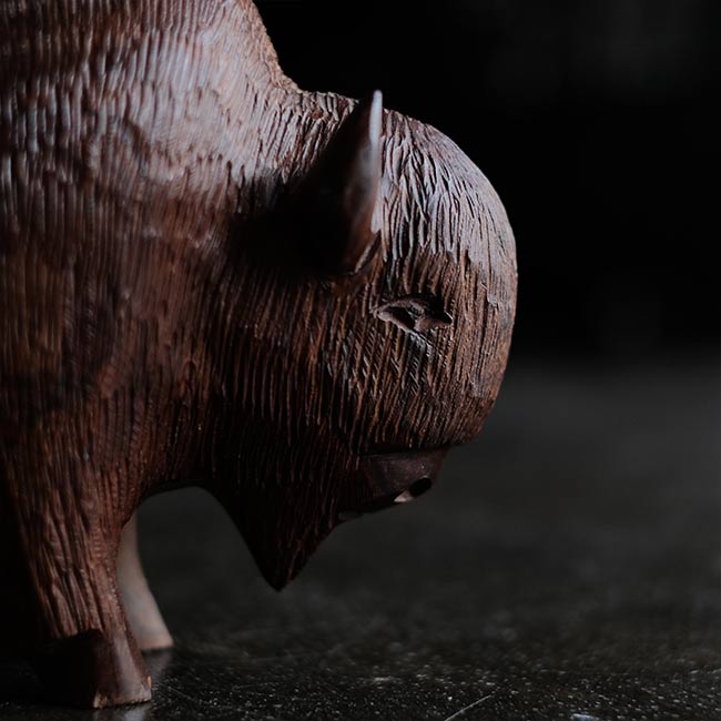 特徴をうまくとらえつつ、愛らしくデフォルメされた木彫りのバイソン。硬い木が使われていて、重量感もあります。そして、とにかく目がやさしい。アメリカ製ですが、メーカーや年代は不明。小キズやくすみは見られますが、ひどいレベルのものではありません。サイズ長さ約17.5cm、幅約7.5cm、高さ約13.4cm