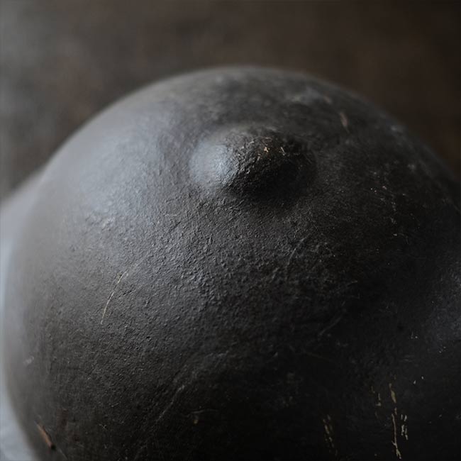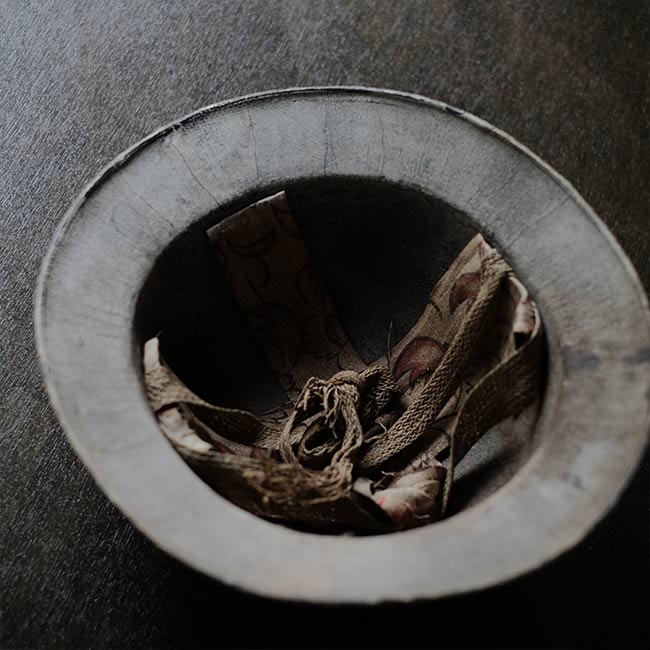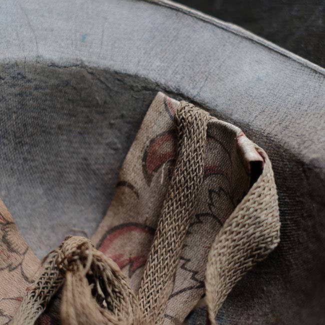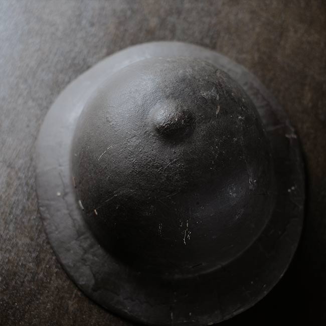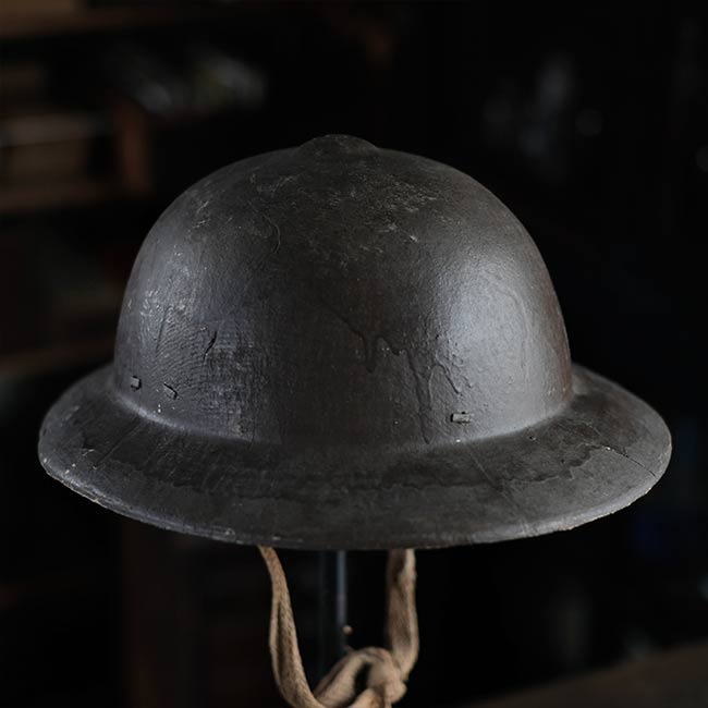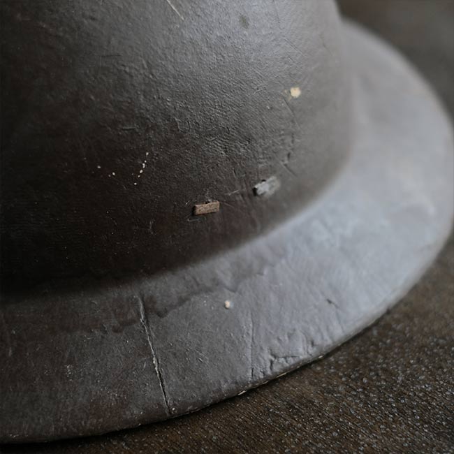 第二次大戦中、金属類は武器等の製造にあてられるため不足しており、一般の金属製品は別の素材で代用されていました。ヘルメットもそのうちの一つで、本品は紙製のヘルメットになります。ボテ箱のような特殊加工を施した硬質ペーパー素材で、手で押した程度ではつぶれないくらいの硬さがあります。