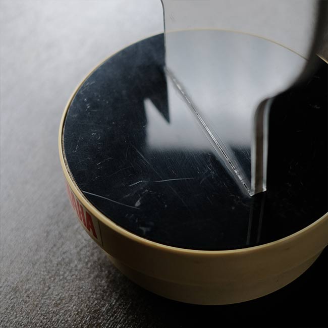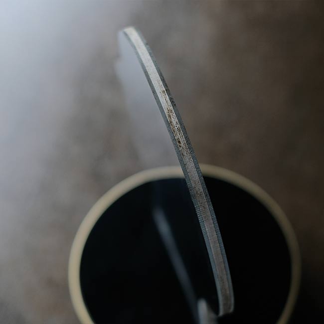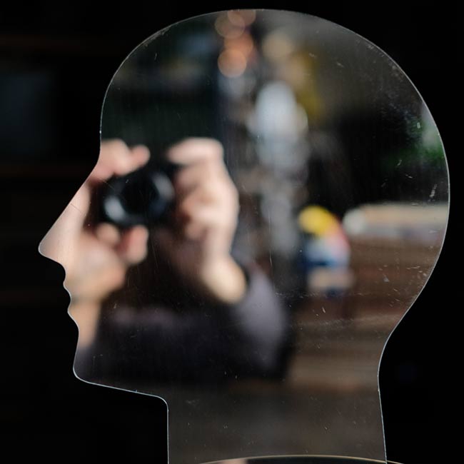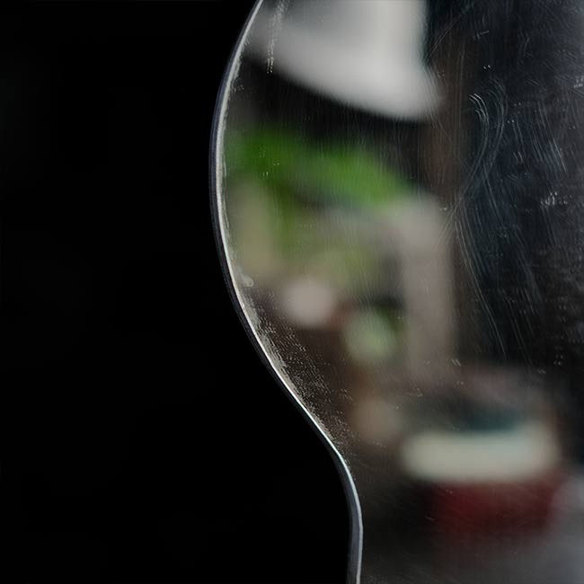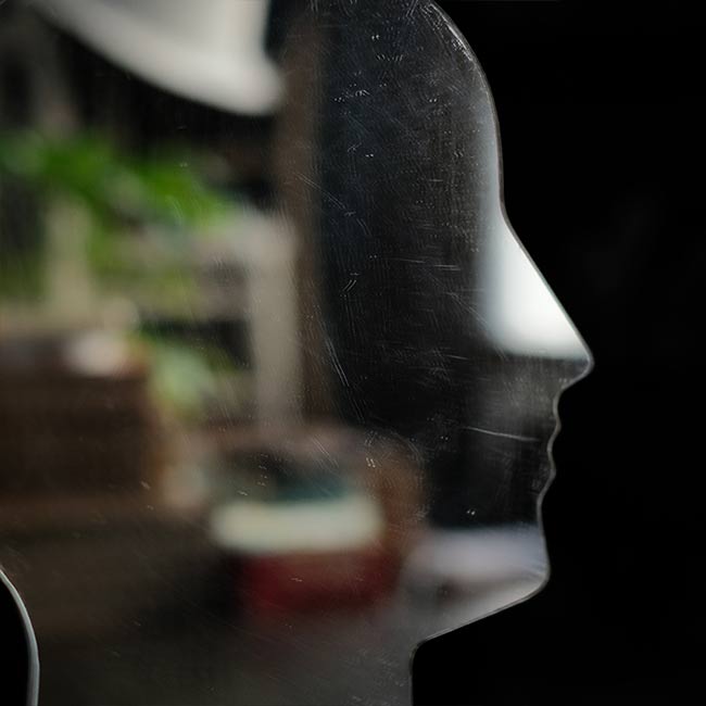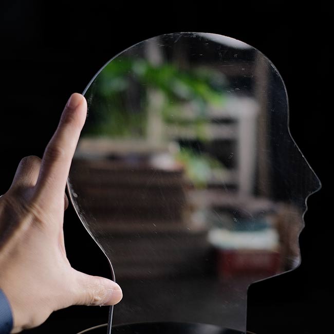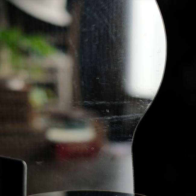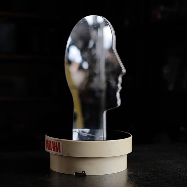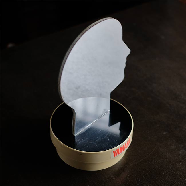 男性の横顔を模したミラーになります。両面ともにミラーになっていて、台座はプラスチック製。